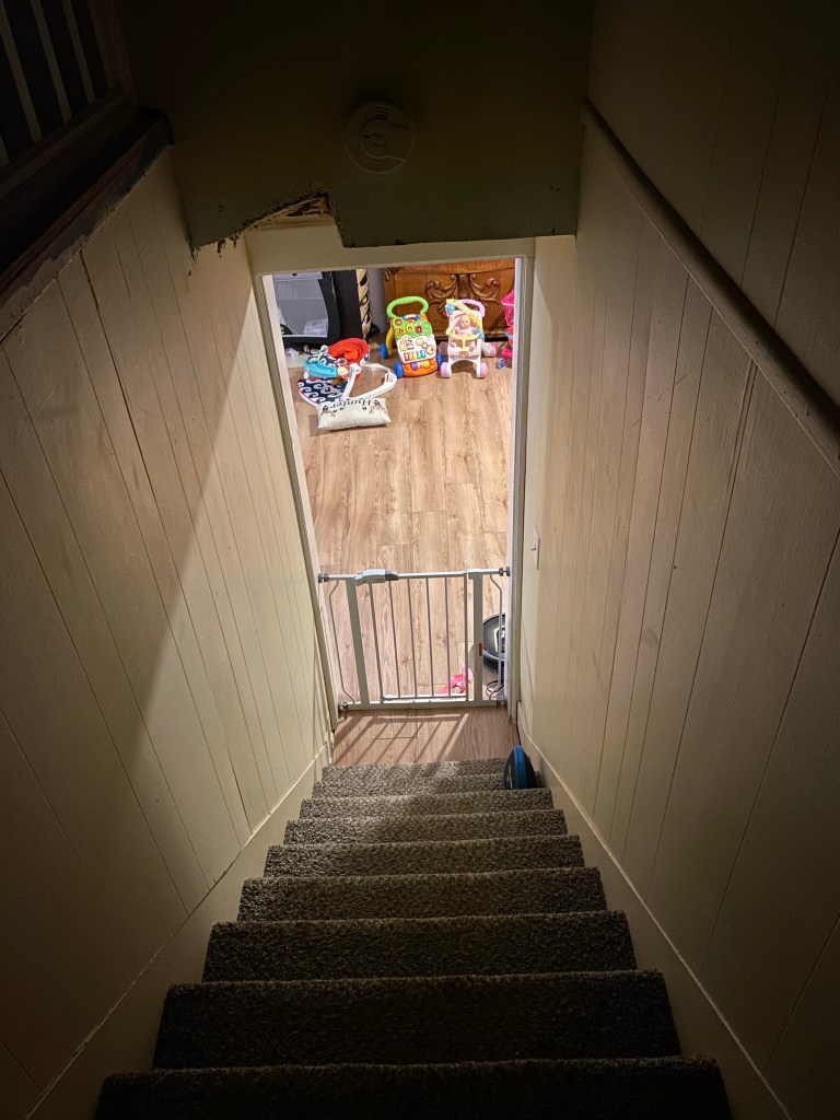 We don’t even notice the missing banister, the painting we never finished, the unfinished edge of the balusters, or the giant cut my FIL had made that was covered that we uncovered to get a bed down and decided to replace but haven’t. Then I sit on these steps listening for my babies and I stress.